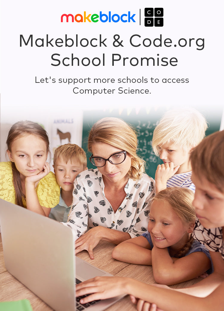Makeblock x Code.org School Promise project is initiated by Makeblock and Code.org. In this project, Makeblock will donate $1-$10 to support Code.org's efforts to prepare more Computer Science educators, raise awareness about computer science learning, and support the expansion and use of Code.org's free courses to increase student access to Computer Science globally.